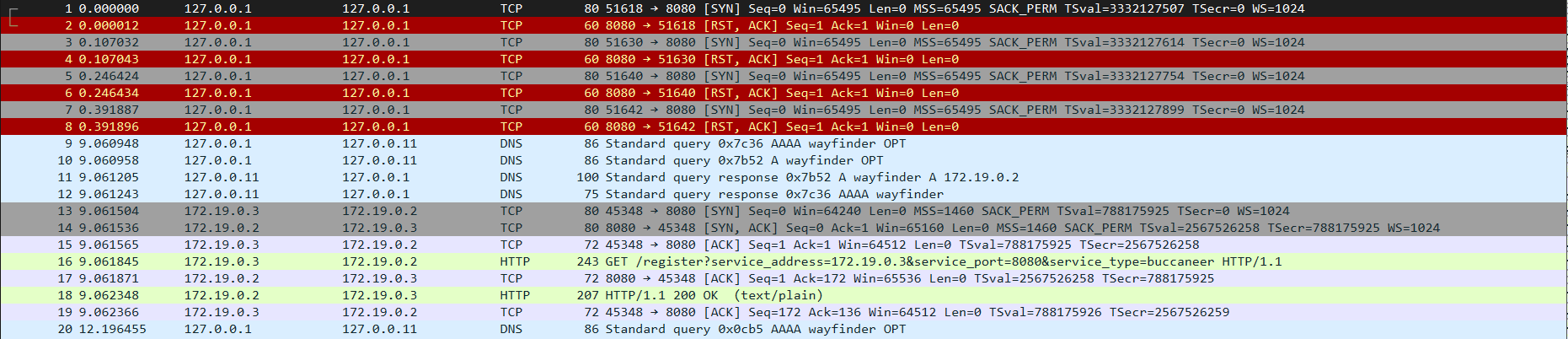 4. Wayfinder returns: {"service_type":"treasure","ip":"172.19.0.4","port":8080} to sloop which then sends the request to treasure.